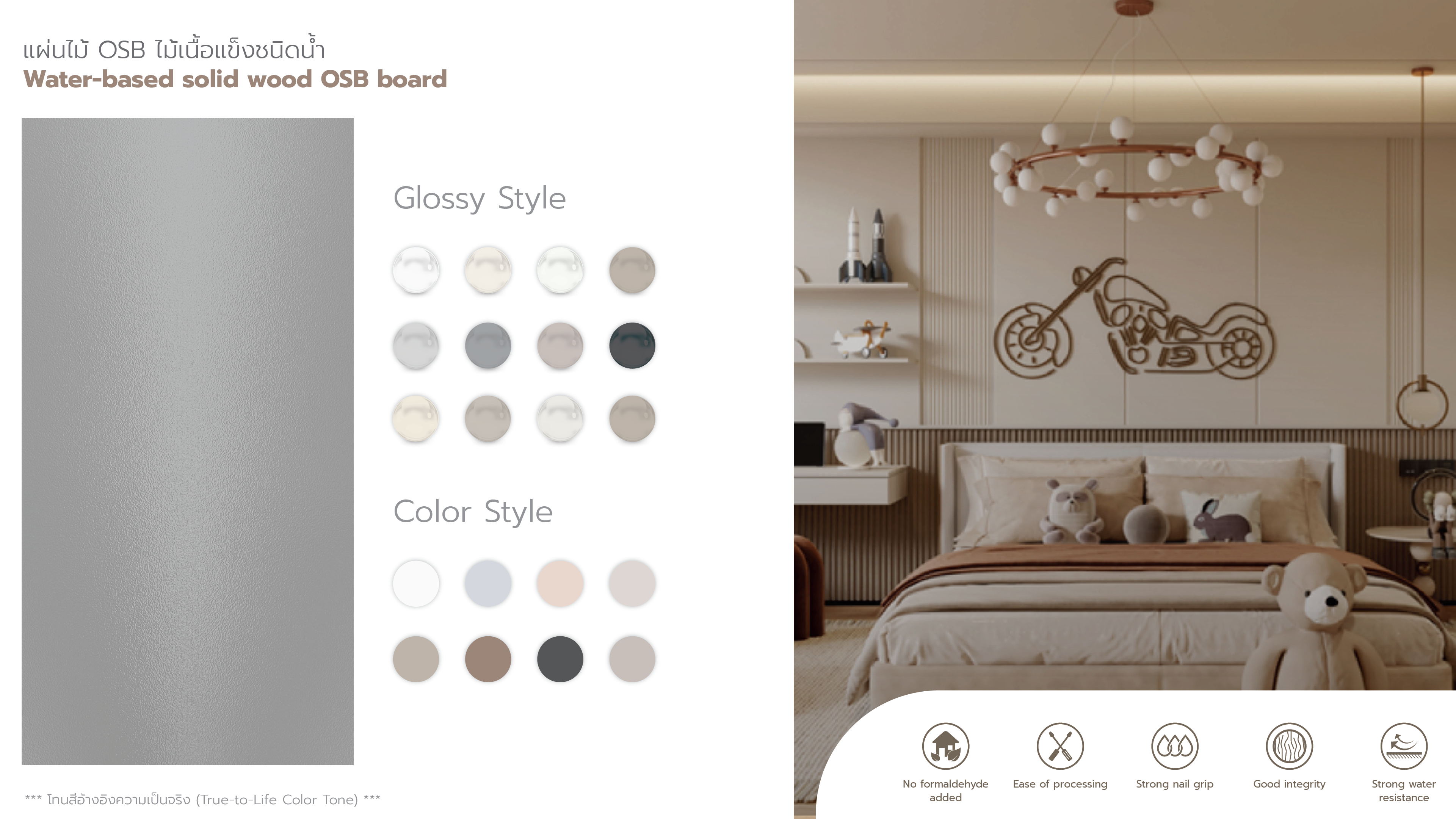 เราใช้แผ่นไม้ฟางธรรมชาติ 100% ที่ปลอดสารพิษและ ปราศจากฟอร์มาลดีไฮด์ การเลือกใช้วัสดุที่มีฟอร์มาลดีไฮด์อาจก่อให้เกิดอันตรายต่อสุขภาพในระยะยาว ซึ่งไม่สอดคล้องกับการสร้างบ้านใหม่ที่ปลอดภัยและน่าอยู่แผ่นไม้ฟางของเราผลิตจากเศษวัสดุการเกษตร เช่น ฟางข้าวและฟางข้าวสาลี โดยใช้กาวเชื่อมประสานที่ทำจากเรซินไอโซไซยาเนต (MDI) ซึ่งไม่ผสมฟอร์มาลดีไฮด์ และพัฒนาด้วยเทคโนโลยีสิทธิบัตรระดับประเทศ