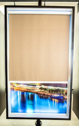 ชุดม่านม้วนซันสกรีน ทำมาจากเส้นใยโพลีเอสเตอร์ 25% และพีวีซี 75% เป็นผ้าที่มีคุณสมบัติพิเศษ แบบของเนื้อผ้าจะมีช่องรูเล็กๆ สามารถให้ลมเข้าผ่านได้อีกทั้งยังกรองแสงได้ประมาญ 5-10% ทำให้ภายในห้องโล่งโปร่งสบายตาไม่ดูทึบจนเกินไป